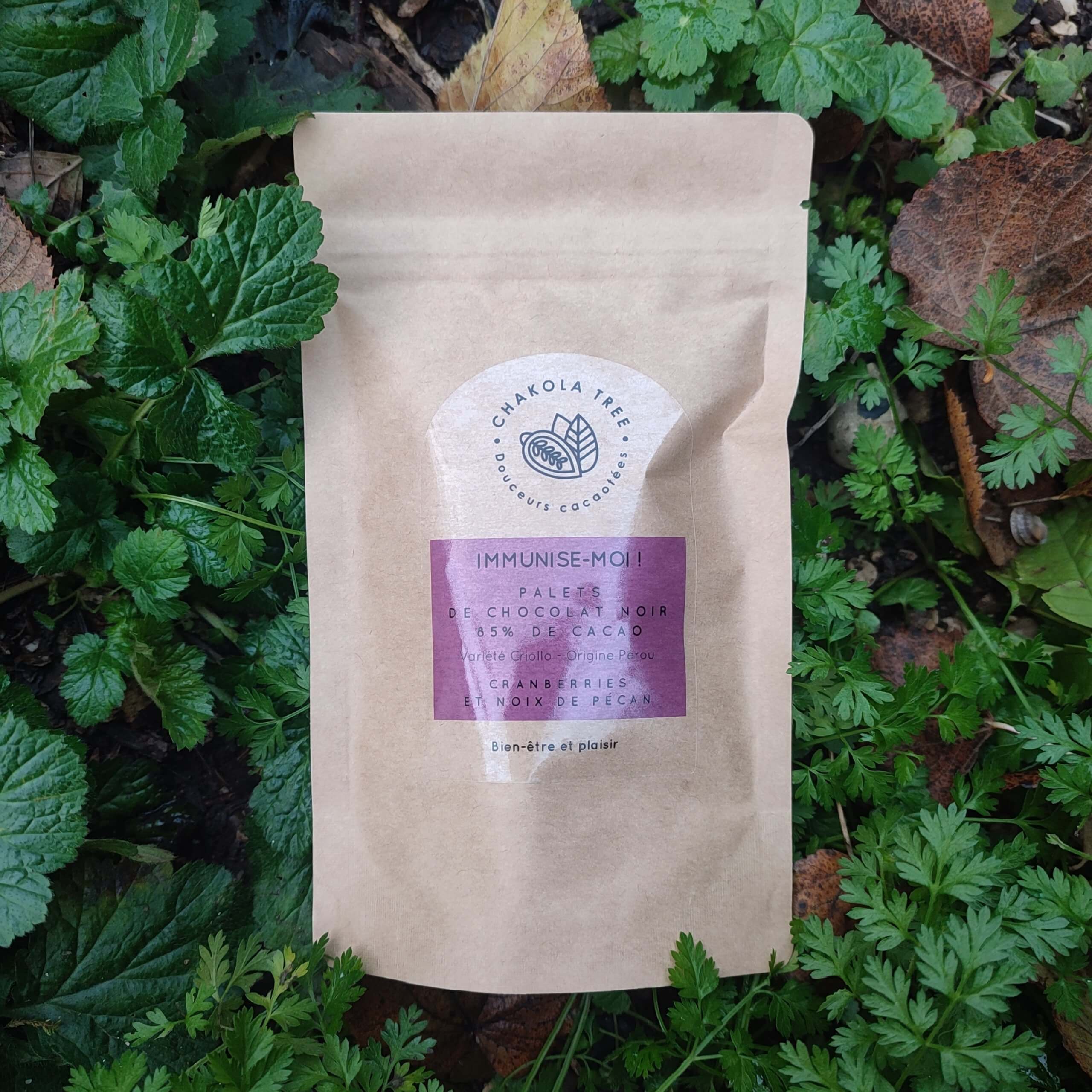 Ingrédients : chocolat noir – cacao minimum 85% (pâte de cacao, sucre de canne complet, beurre de cacao), cranberries (7%), cerneaux de NOIX DE PÉCAN (7%).