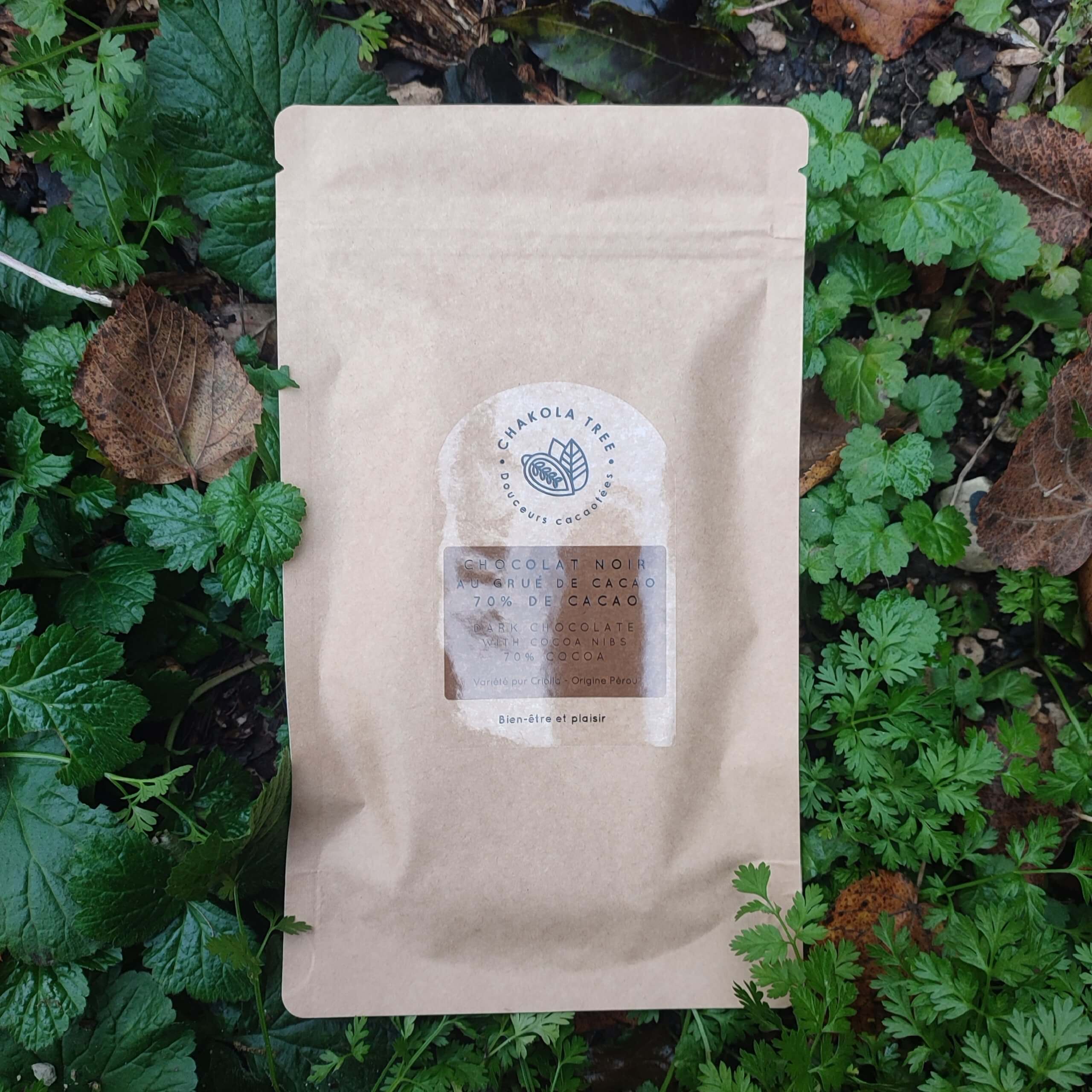 Ingrédients : chocolat noir – cacao minimum 70% (pâte de cacao, sucre de canne complet, beurre de cacao), grué de cacao (7,5%).