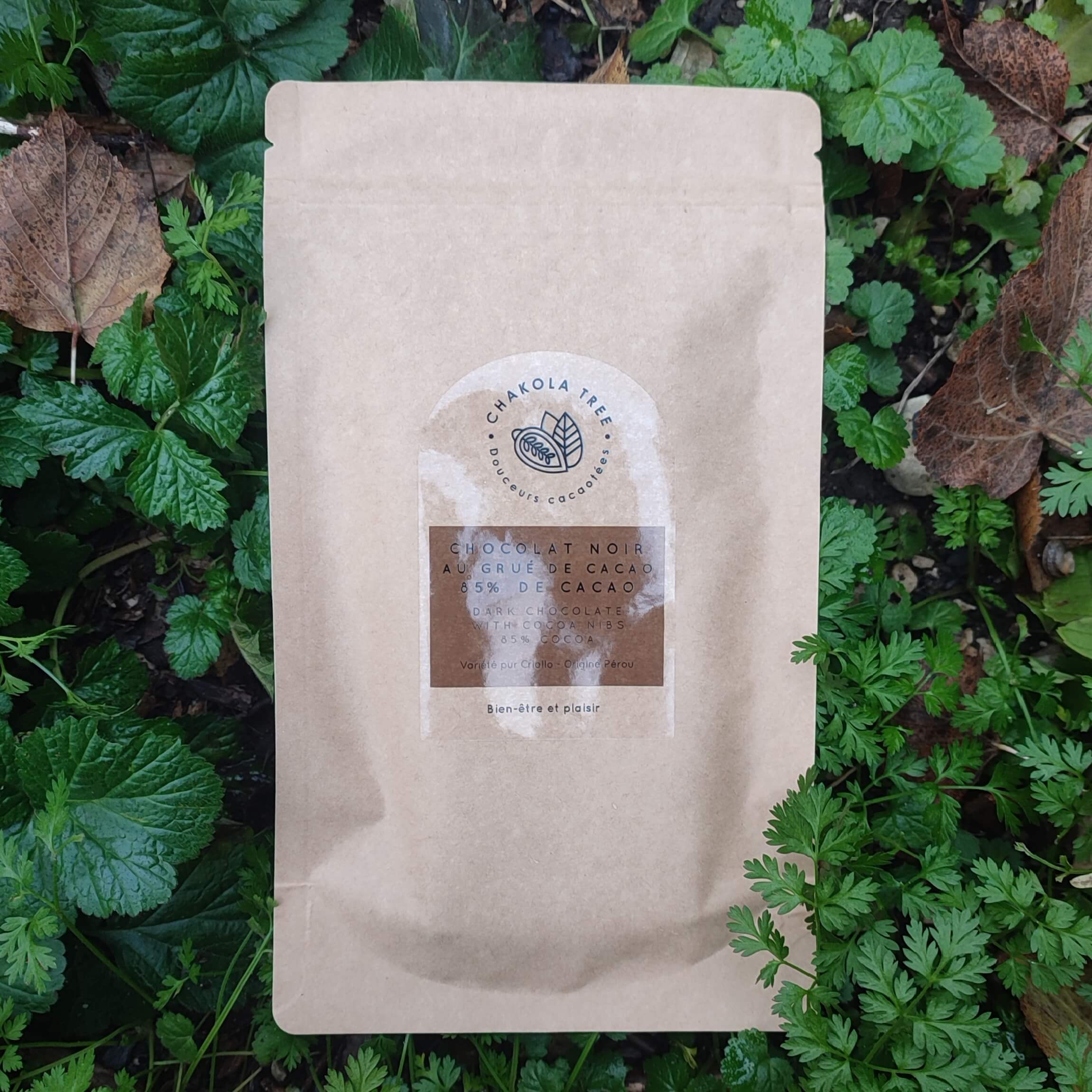 Ingrédients : chocolat noir – cacao minimum 85% (pâte de cacao, sucre de canne complet, beurre de cacao), grué de cacao (7,5%).